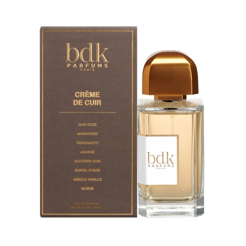Дървесни BDK Parfums Creme de Cuir е изтънчен унисекс аромат, съчетаващ минимализъм и лукс. Лансиран през 2018 година, този парфюм е част от колекцията на нишовата марка BDK Parfums, която се отличава с прецизност и иновация в създаването на аромати. Creme de Cuir е предназначен за хора, които търсят мек, съвременен кожен аромат с нежни флорални и плодови акценти.