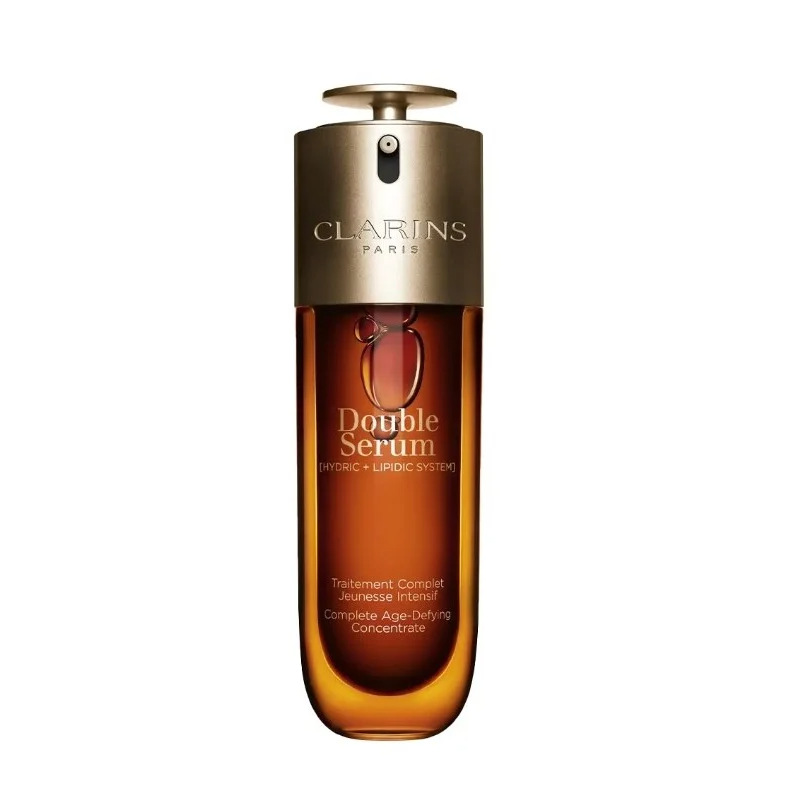 Clarins Double Serum е интензивен анти-ейдж серум за лице с двойна формула на водна и маслена основа. Съдържа 21 мощни растителни екстракта, които действат в синергия за видимо по-гладка, по-стегната и озарена кожа. Подпомага естественото производство на колаген и възстановява еластичността на кожата. Серумът се бори с признаците на стареене като фини линии, бръчки и загуба на блясък. Има лека, немазна текстура, която бързо се абсорбира. Подходящ е за всички типове кожа, включително и чувствителна. Иновативната му помпа позволява регулиране на дозата според нуждите на кожата. Дерматологично тестван и без парабени.