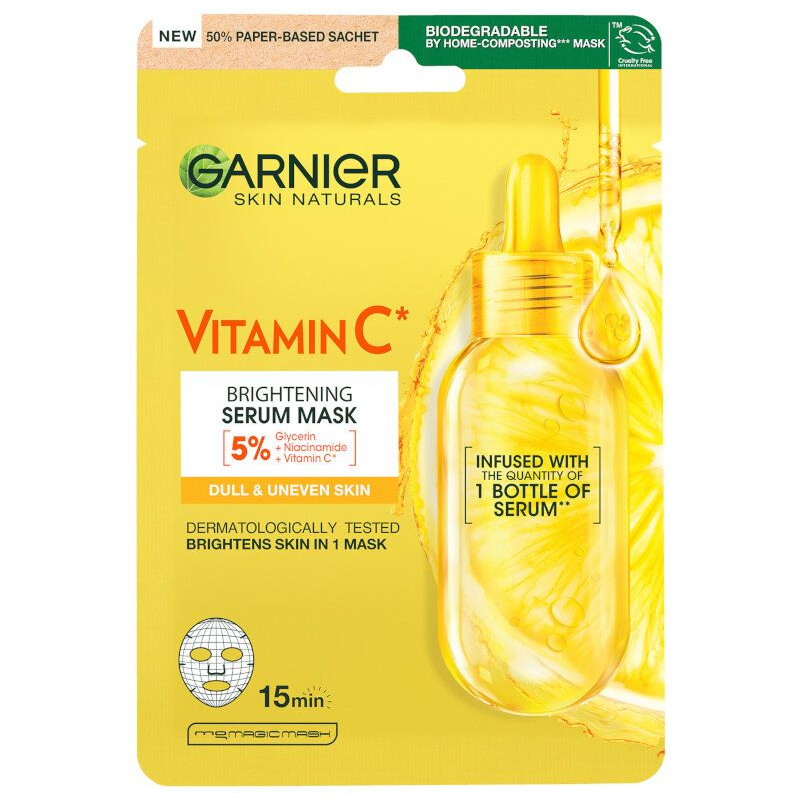 Garnier Skin Naturals Vitamin C Serum Mask е озаряваща серум-маска, създадена да изравни тена, намали умората и придаде блясък на кожата само за 15 минути. Формулата ѝ е обогатена с витамин C и хиалуронова киселина, които озаряват, хидратират и освежават кожата.