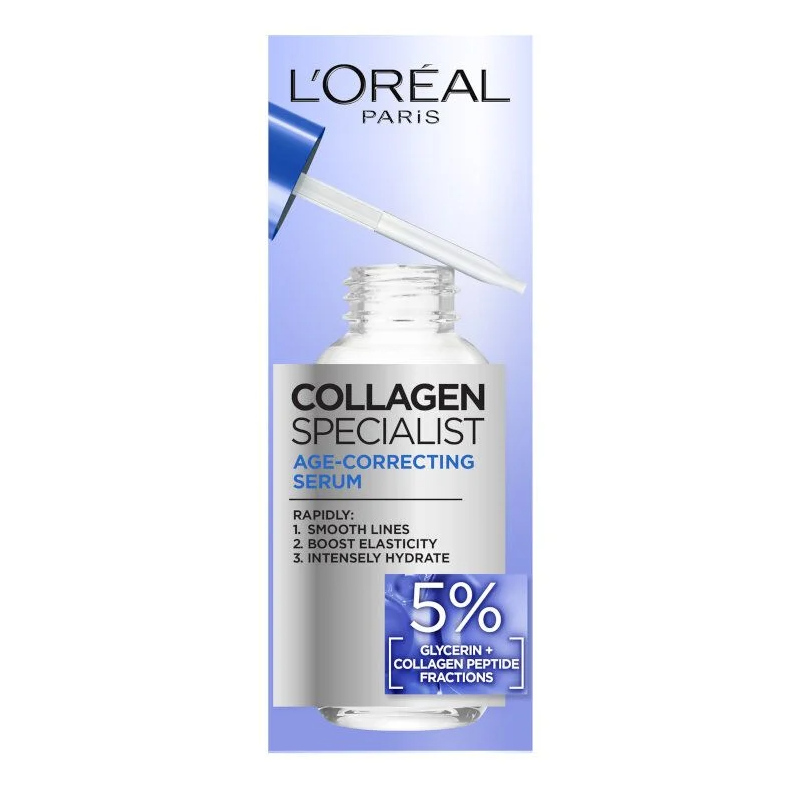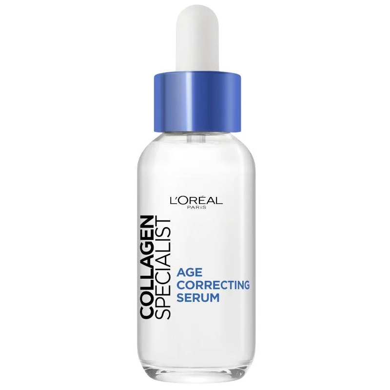 L'Oreal Paris Collagen Specialist Age-Correcting Serum е интензивен серум против стареене, създаден за възстановяване на плътността и еластичността на кожата. С напредване на възрастта нивата на колаген в кожата намаляват, което води до загуба на стегнатост, поява на бръчки и отпускане на контурите на лицето. Този серум е обогатен с чист колаген, който изглажда бръчките и възвръща младежкия вид.
