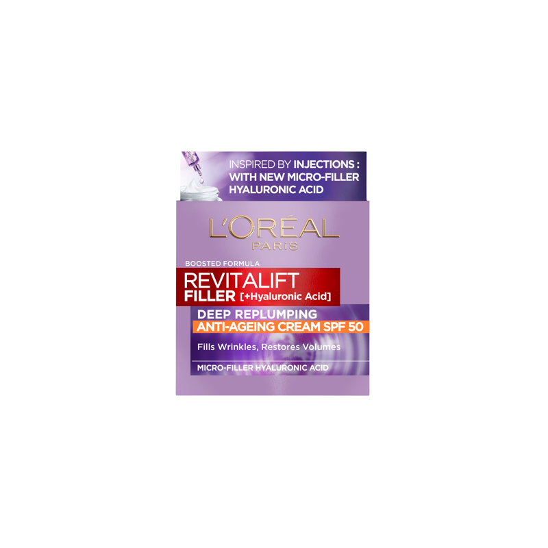 L'Oreal Paris Revitalift Filler SPF50 е възстановяващ дневен крем за лице, който съчетава анти-ейдж грижа с висока слънцезащита SPF50. Този крем е специално разработен за зряла кожа, склонна към признаци на стареене като бръчки, дехидратация и загуба на обем. С иновативната си формула, обогатена с хиалуронова киселина и Pro-Xylane, кремът активно възстановява и възстановява плътността на кожата, като я прави по-стегната, по-гладка и хидратирана.