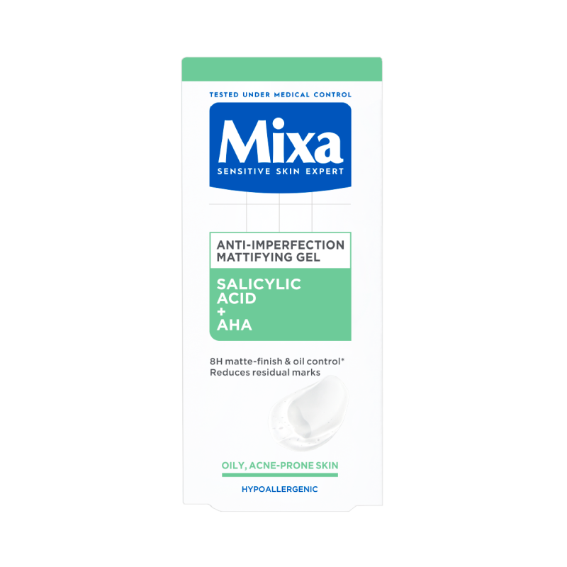 Осигурява 8-часов матиращ ефект и намалява излишния себум*. КОМБИНАЦИЯ ОТ ДЕРМАТОЛОГИЧНО АКТИВНИ СЪСТАВКИ: Салицилова киселина: позната е с това, че бета-хидрокси киселината (BHA) намалява излишния себум, свива порите и намалява появата на петна. Алфа-хидрокси киселина: позната е с това, че намалява видимостта на петната, минимизира порите и подобрява текстурата на кожата. КЛИНИЧНО ДОКАЗАНИ РЕЗУЛТАТИ.Мигновено: прави порите по-малко видими и осигурява матов финиш. След 4 седмици: намалява видимостта на петната и следите от пъпки**. НАЧИН НА УПОТРЕБА: Освежаваща гел текстура. Некомедогенен. Използвайте след почистване на лицето и нанасяне на серум. Избягвайте зоната около очите. Опаковка с помпа, която предпазва формулата от контакт с въздуха. ГАРАНЦИЯ MIXA ЗА ЧУВСТВИТЕЛНА КОЖА: ТЕСТВАНО ПОД МЕДИЦИНСКИ КОНТРОЛ. ДОКАЗАНА ЕФЕКТИВНОСТ. ХИПОАЛЕРГЕННА ФОРМУЛА. ТЕСТВАН ВЪРХУ 100% ЧУВСТВИТЕЛНА КОЖА. *Инструментален тест, 24 души. **Клиничен тест, 41 участници.