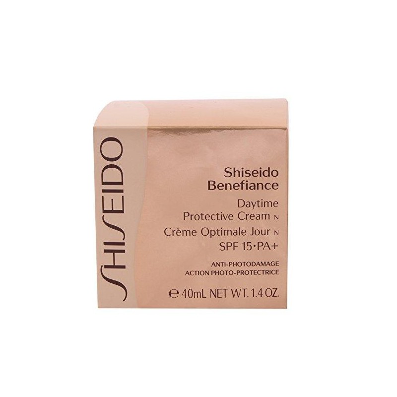 Shiseido Benefiance Daytime Protective Cream SPF 15 PA+ e овлажняващ крем за лице който предотвратява стареенето на кожата. Редовната му употреба ще ви предпази от появата на фини линии и по-дълбоки бръчки, неравномерен тен, загуба на еластичност и увреждане на клетките. Хидроксипролин-една от съставките, е аминокиселина която стимулира естественото производство на колаген. Екстрактът от хлорела съживява, интензивно хидратира и запазва кожата мека и гладка.