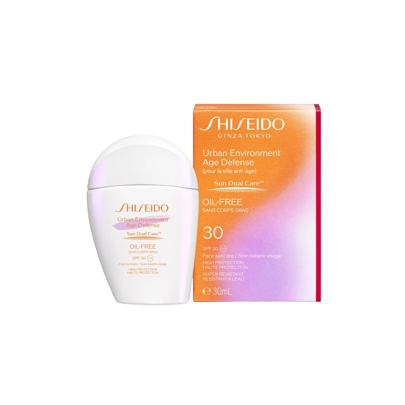 Слънцезащитният крем за лице Shiseido Urban Environment Age Defence Oil-Free с SPF 30 осигурява същевременно защита от слънчевите лъчи и грижа против стареене. Този много лек хидратиращ крем не оставя усещане за омазняване, дори напротив! Незабавно матира кожата и я подготвя за нанасяне на грим. Благодарение на технологията Sun Dual Care™ кожата ще бъде не само защитена от слънчевите лъчи, но и още по-красива, защото използва предимствата на слънчевата светлина. Технологията SuperVeil-UV 360™ с SPF 30 осигурява защитна преграда срещу слънцето и замърсения въздух. Бързо ще се влюбите в този крем за ежедневна грижа. Характеристики:предпазва кожата от UV лъчите, както и от замърсен въздух и прах,предотвратява появата на бръчки и преждевременното стареене на кожата,осигурява хидратация на кожата и ѝ придава освежен вид лека, сатенено мека текстура без масла, оставя кожата матирана ,идеален като основа под фон дьо тен,некомедогенен, без масла дерматологично и офталмологично тестван продукт Съставки:технология Sun Dual Care™ – предпазва от ултравиолетовите лъчи, като същевременно използва слънчевата светлина за насърчаване на красотата на кожата и защита от преждевременно стареене SuperVeil-UV 360™ – технология за защита от UVA и UVB лъчи и фини прахови частици, невидима защита, SPF 30 Spirulina Energy Essence – действа срещу факторите, които могат да причинят стареене на кожата Anti-Sebum Damage Complex – предпазва от негативното действие на UV лъчите, замърсяването и прекомерния себумхиалуронова киселина Използвайте всяка сутрин, след почистване и серум. Нанесете крем върху върха на пръстите и го разнесете на бузите, челото, носа и брадичката.
