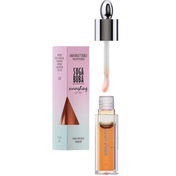 Suga Buba Unforgettable Nourishing Lip Oil е създадено, за да предостави на устните ви интензивна хидратация и подхранване. Обогатен с подхранващи съставки като масло от жожоба, баобаб и слънчогледово масло, този продукт дълбоко хидратира и подхранва устните. Формулата осигурява леко докосване на цвят, като оставя устните меки, гладки и младежки..