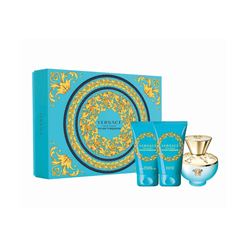 Versace Dylan Turquoise е вдъхновяващ аромат, който улавя духа на лятото с освежаващи цитрусови нотки и екзотична елегантност. Подаръчният комплект е идеален за всяка жена, която обича свежестта на морския бриз и тропическите градини.
