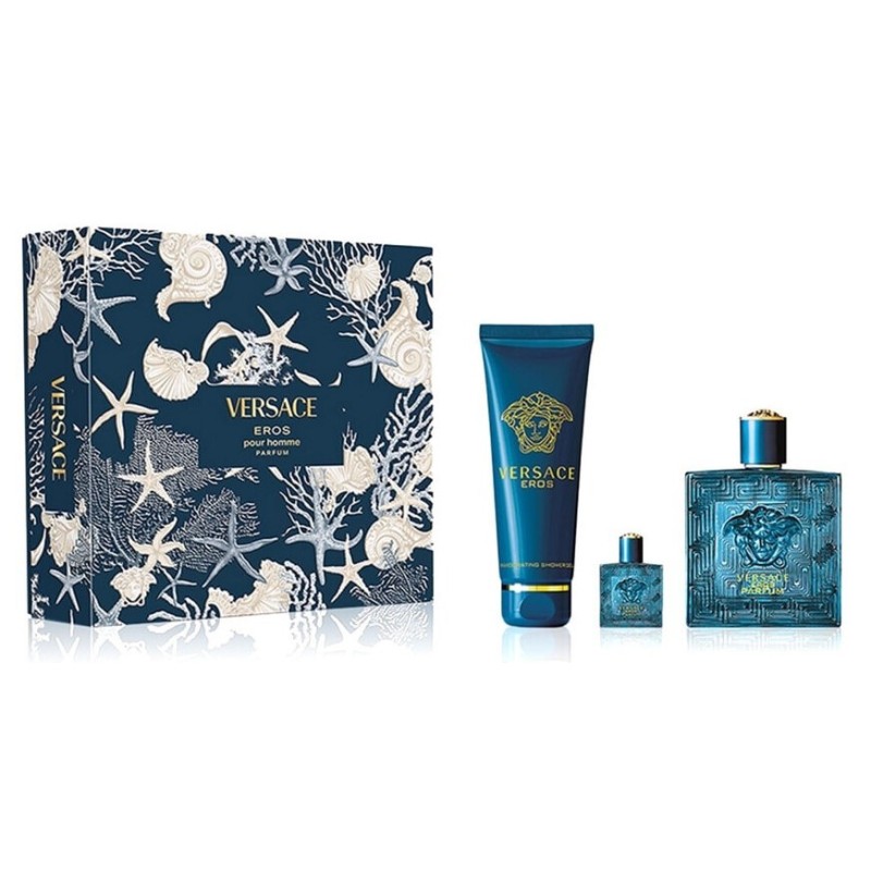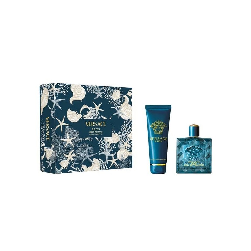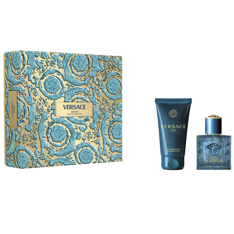 Флаконът на Версаче Ерос е украсен с характерния за Versace знак - главата на горгона Медуза, избран за символ на марката от основателя на компанията Джани Версаче още в първите години, когато издига и укрепва своята модна империя. Опаковката на Versace Eros EDT е решена в наситен тюркоазен цвят, който подчертава свежия и средиземноморски характер на аромата. Уханието се предлага в разфасовки от 50 и 100 ml EDT. Лансирано е със серия ароматни продукти за грижа за кожата.